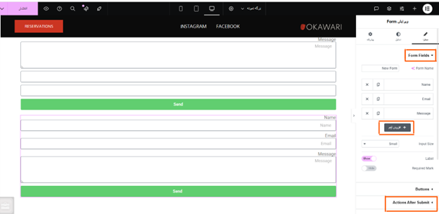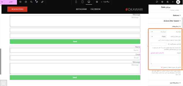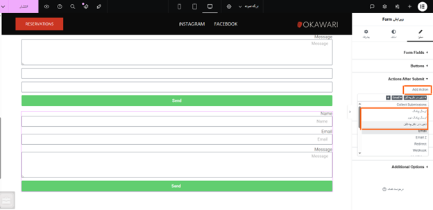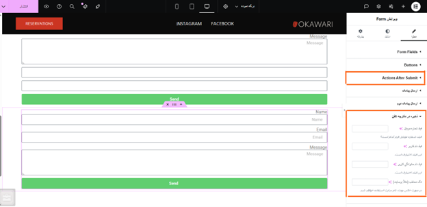 مرحله نهم: پس از انتخاب فرم دلخواه در تنظیمات المنتور پرو، وارد بخش ویرایش فرم شوید. در این بخش میتوانید فرم موردنظر را به گونهای تنظیم کنید که پس از پر شدن توسط کاربر، به صورت خودکار پیامکی ارسال شود.همچنین این امکان وجود دارد که مدیر سایت نیز همزمان با ارسال فرم، یک پیامک اطلاعرسانی دریافت کند.