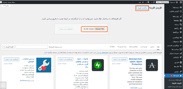 حالا به صفحه وردپرسی خود برگردید و گزینه “بارگزاری افزونه” را بزنید.