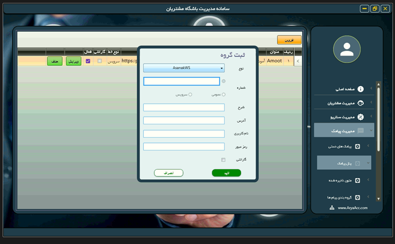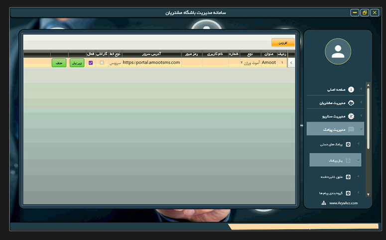 شما با خرید سامانه پیامکی در نرمافزارهای گروه آریا، با سامانه پیامک آموت لینک میشوید؛ تنظیمات اولیه ارسال پیامک به شرح زیر است: